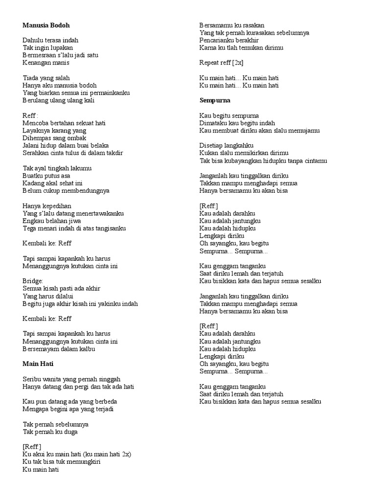 Lirik lagu cinta kita memang tak sempurna tapi ku yakin. Yang kaupun tak punya biarlah C G aku akan pergi tinggalkan E Am semua cinta ini selamanya G patahkanlah sayapku F saat aku mencoba E berpaling dari kasih Am dan sayangmu G maka bunuhlah aku F bila aku mencoba E berpaling dan mencari Am penggantimu Interlude. Intro A Fm Bm E A Fm Bm E Verse A Fm Aku memang tak berhati besar Bm E Untuk memahami hatimu di sana A Fm Aku memang tak berlapang dada Bm E Untuk menyadari kau bukan milikku lagi B.