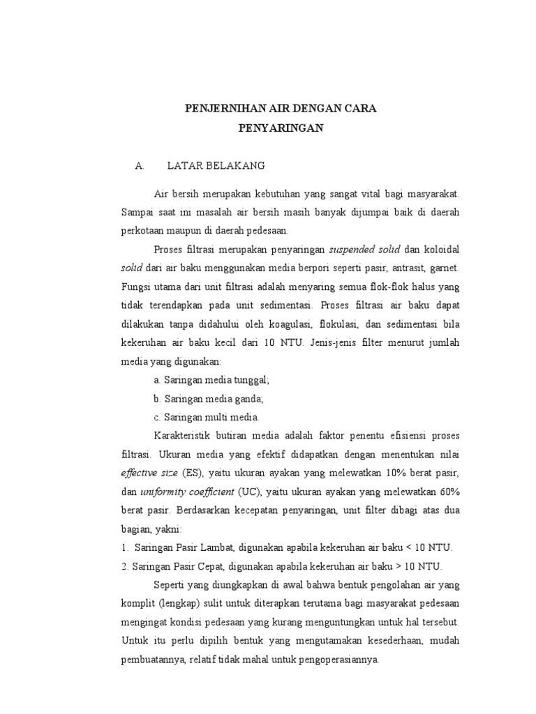 Penyaringan atau filtrasi merupakan proses pemisahan padatan yang terlarut di dalam air. Menurut Nurdin2002 Impl ementasi adalah suatu tindakan atau pelaksanaan dari sebuah rencana yang sudah disusun secara matang dan terperinci. Alat yang bisa dipakai untuk tehnik penyaringan air yang paling mudah yaitu.